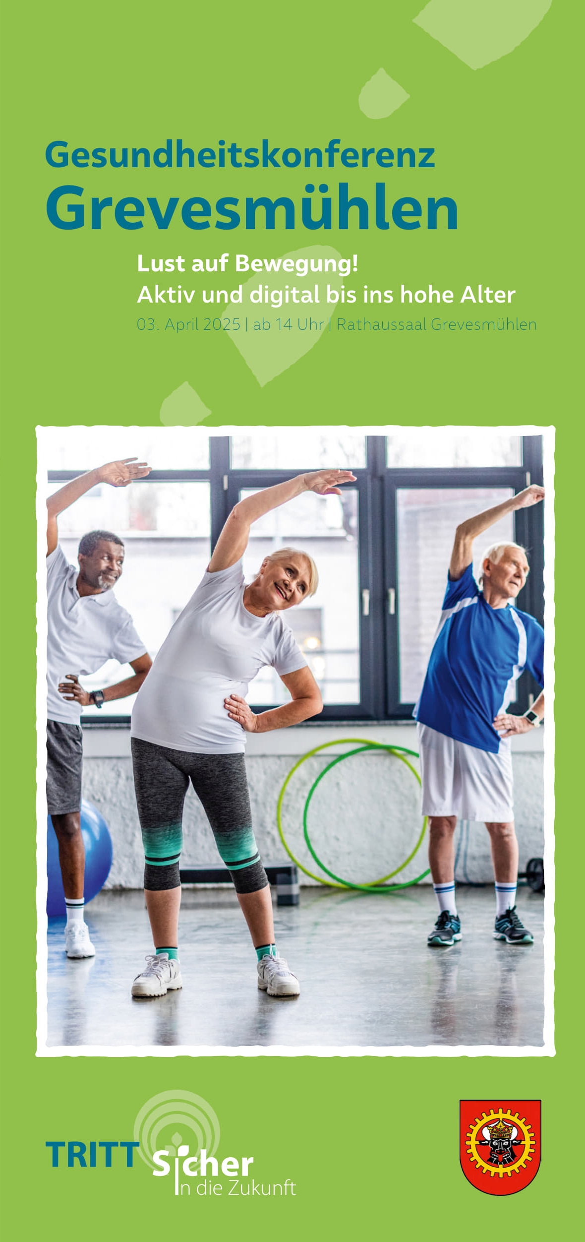 Am 3. April 2025 präsentiert Grevesmühlen die nächste Gesundheitskonferenz! Dieses Jahr widmet sie sich den Themenschwerpunkten Bewegung und Digitales. Gemeinsam mit dem Studienzentrum „Trittsicher in die Zukunft“ der Sozialversicherung für Landwirtschaft, Forsten und Gartenbau (SVLFG) laden wir Sie herzlich ein zu einem abwechslungsreichen Nachmittag mit spannenden Vorträgen, Praxisbeispielen und Themenständen verschiedener Einrichtungen, Vereine und Initiativen.