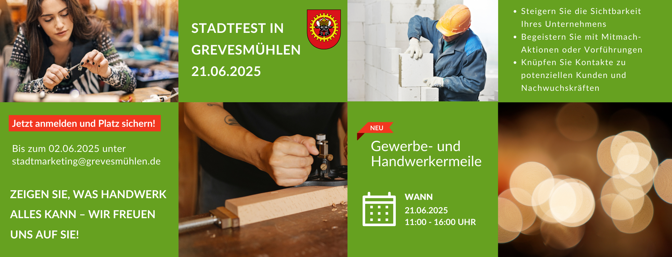 Zum kommenden Stadtfest wird es am Samstag, 21. Juni 2025, erstmalig eine Gewerbe- und Handwerkermeile in Grevesmühlen geben. Auf dieser können Handwerksbetriebe und Gewerbetreibende aus Grevesmühlen und der nahen Umgebung sich und ihr Handwerk präsentieren und den Festbesuchern verschiedene Programmpunkte bieten.